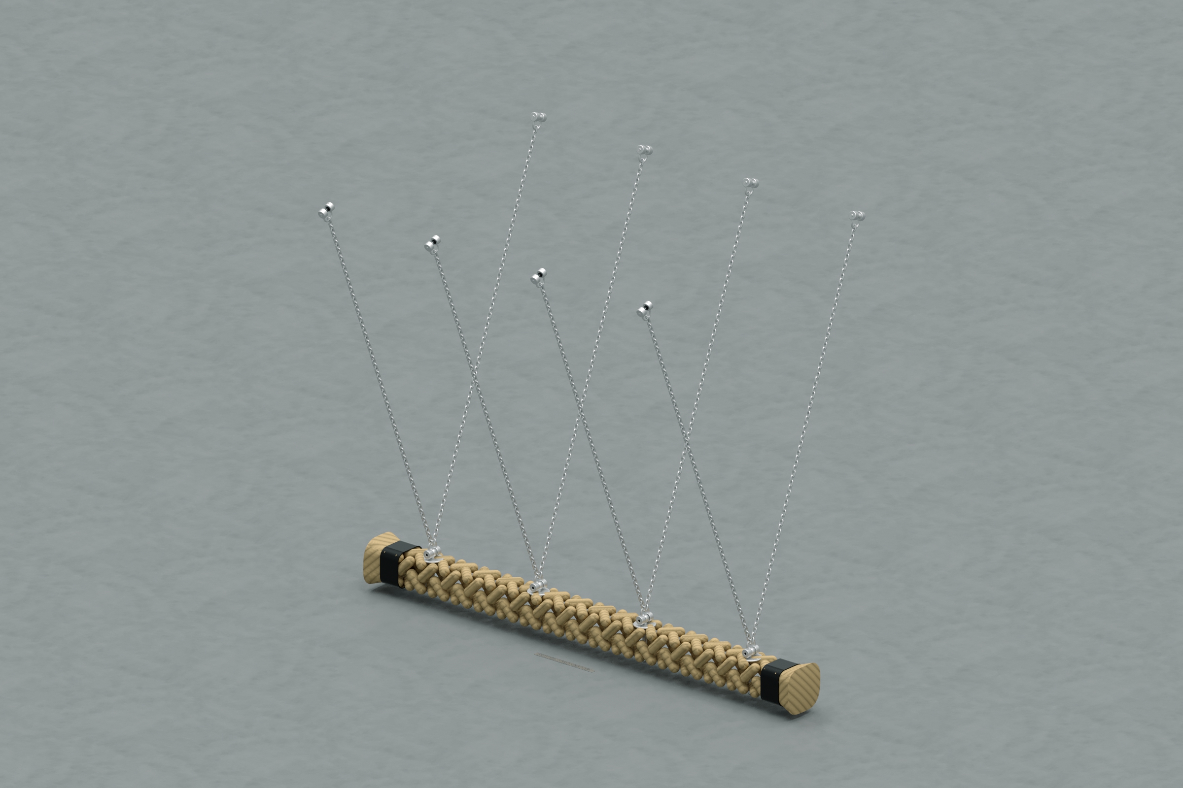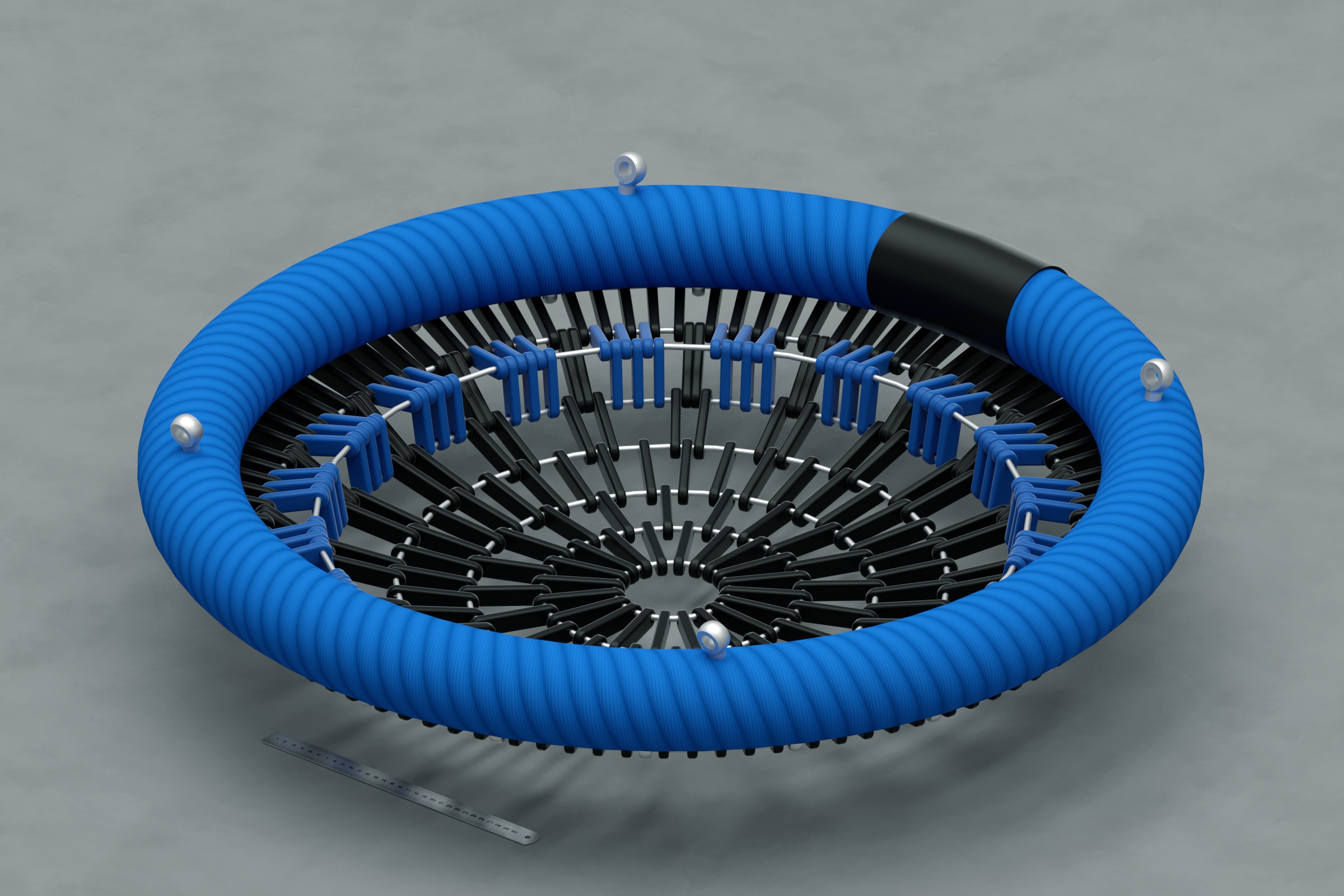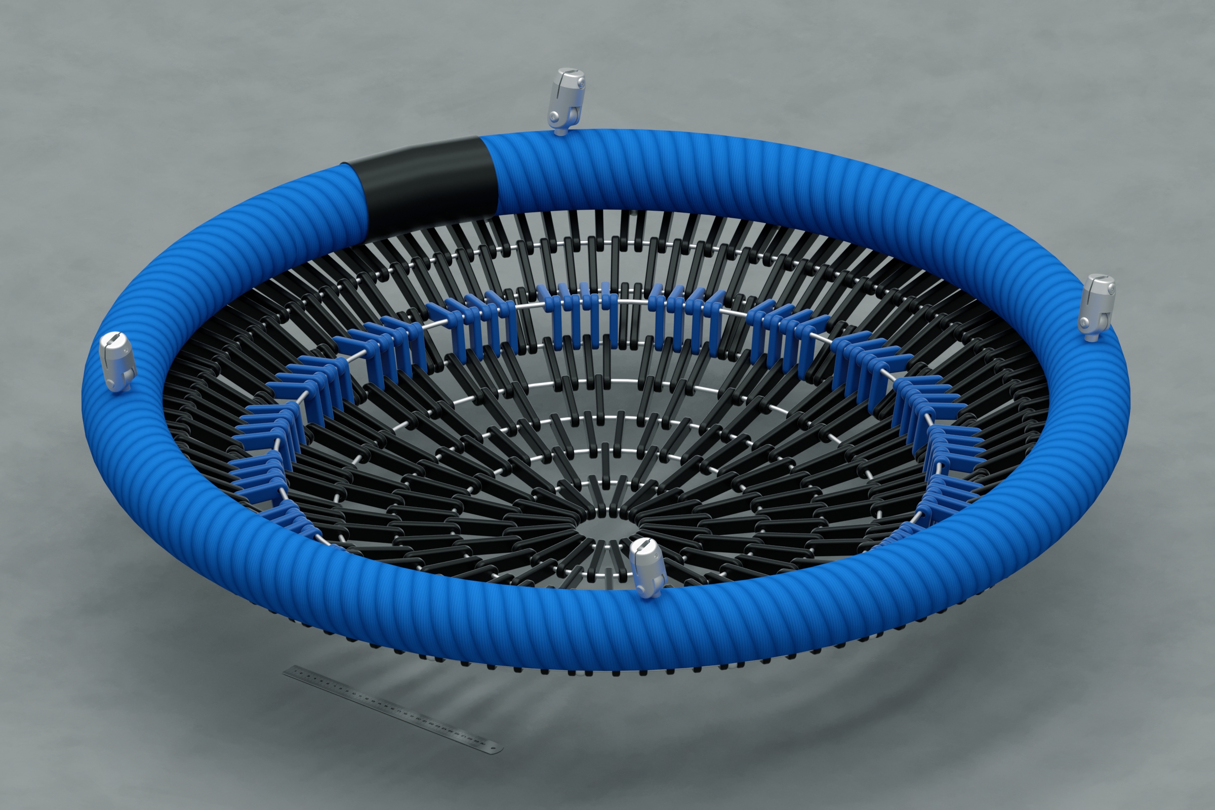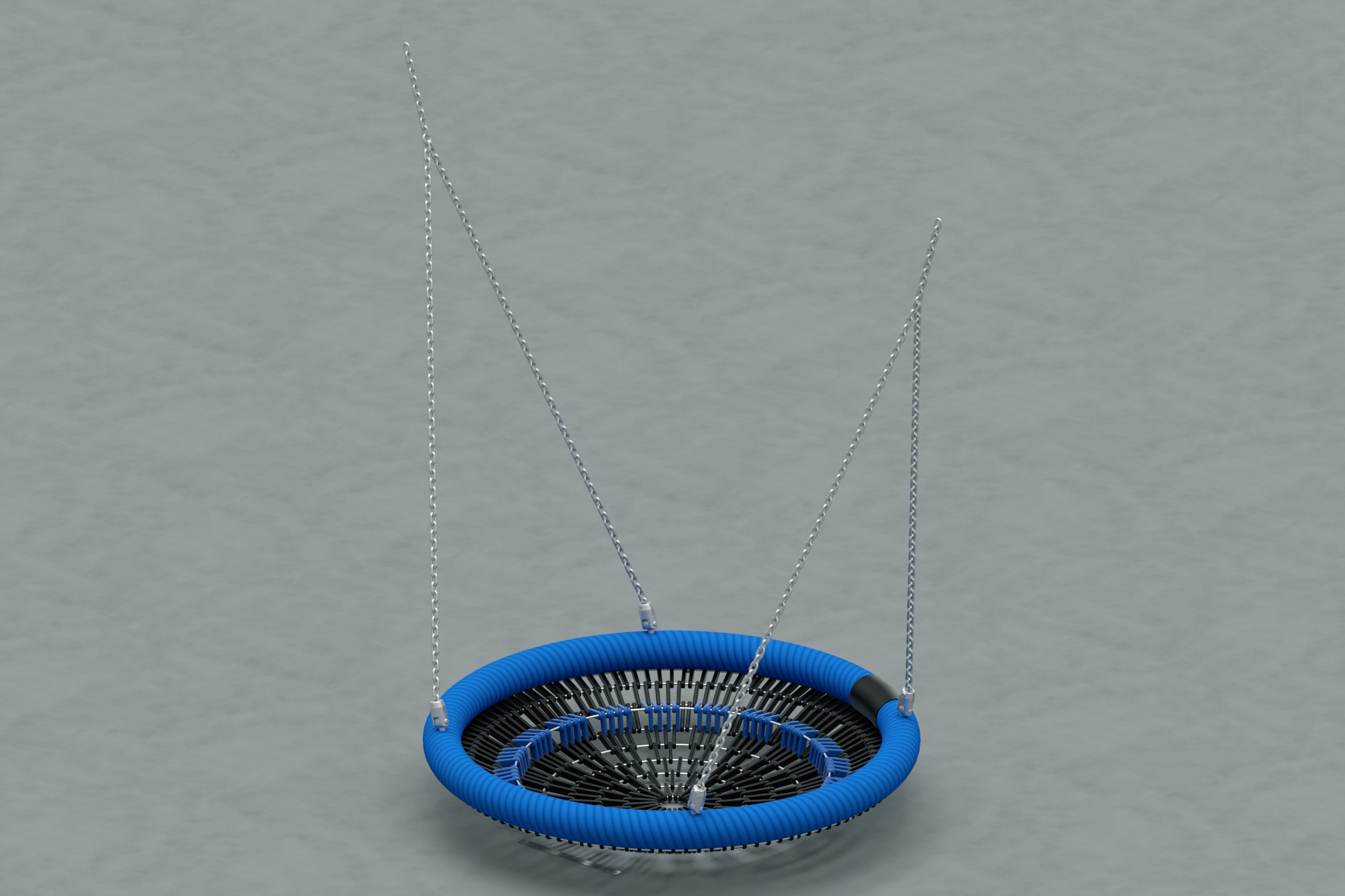Art.: 1060555 | Schaukelkorb mit Rundum-Dämpfung aus PUR Schaum und PE-Seilummantelung blau Ø 20 mm; Korbring Ø 0,95 m aus Edelstahlrohr Ø 38 mm, Wandstärke 2 mm; Korb aus Kunststoffgliedern blau-schwarz, verbunden mit Stahlseil. Die TÜV-geprüfte, maximale Beschleunigung beträgt 50g. Der Grenzwert liegt lt. DIN EN 1176-2 bei 120g. Der Flächenpressung beträgt nach TÜV Prüfung 79,6 N/cm², der Grenzwert liegt bei 90N/cm². Kettenbefestigung mit Klemmadapter aus Edelstahl. Trapezförmige Kettenabhängung bestehend aus Edelstahlketten Ø 7 mm, mit integrierten, kugelgelagerten Drehwirbeln, um ein Verknoten der Ketten zu verhindern.