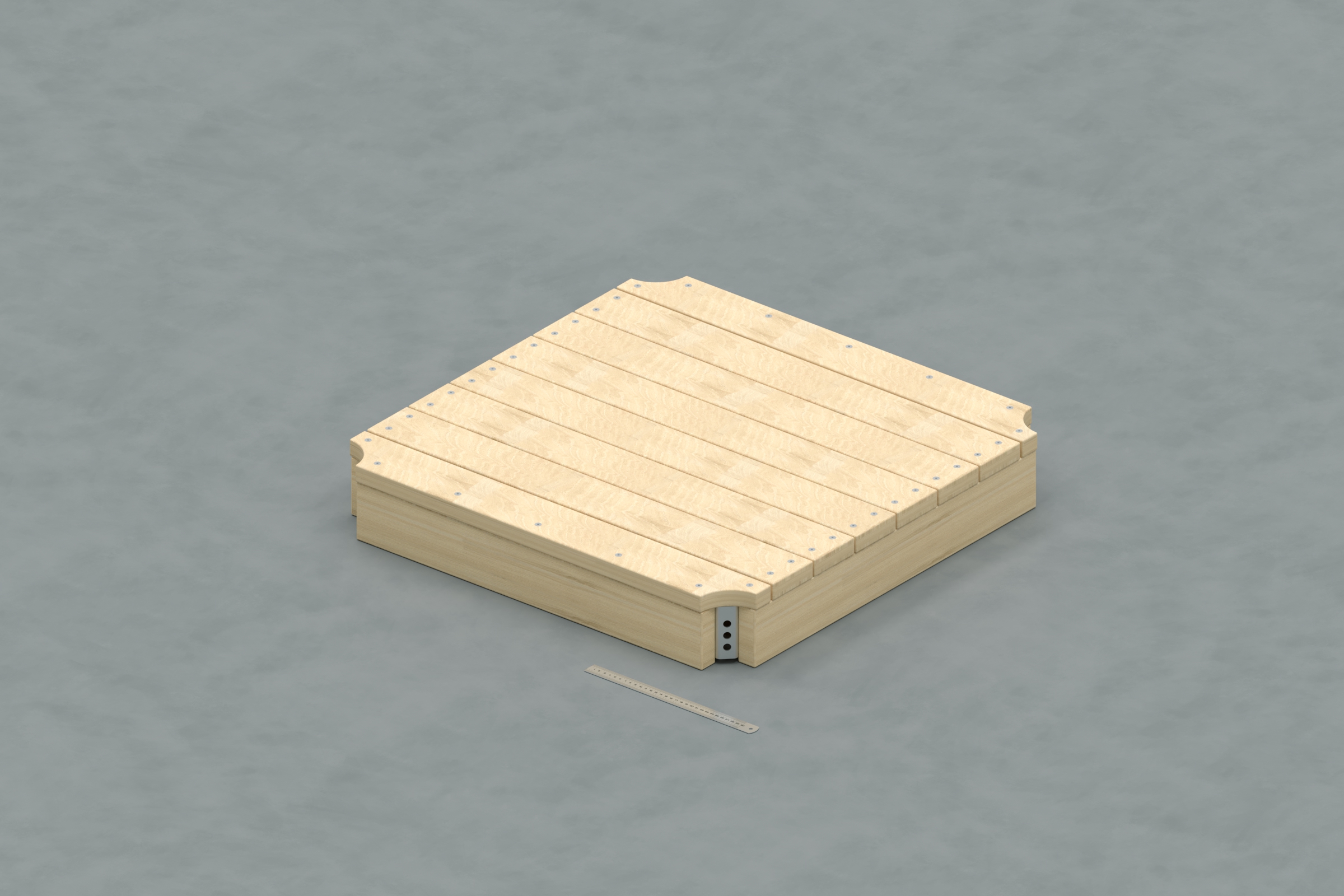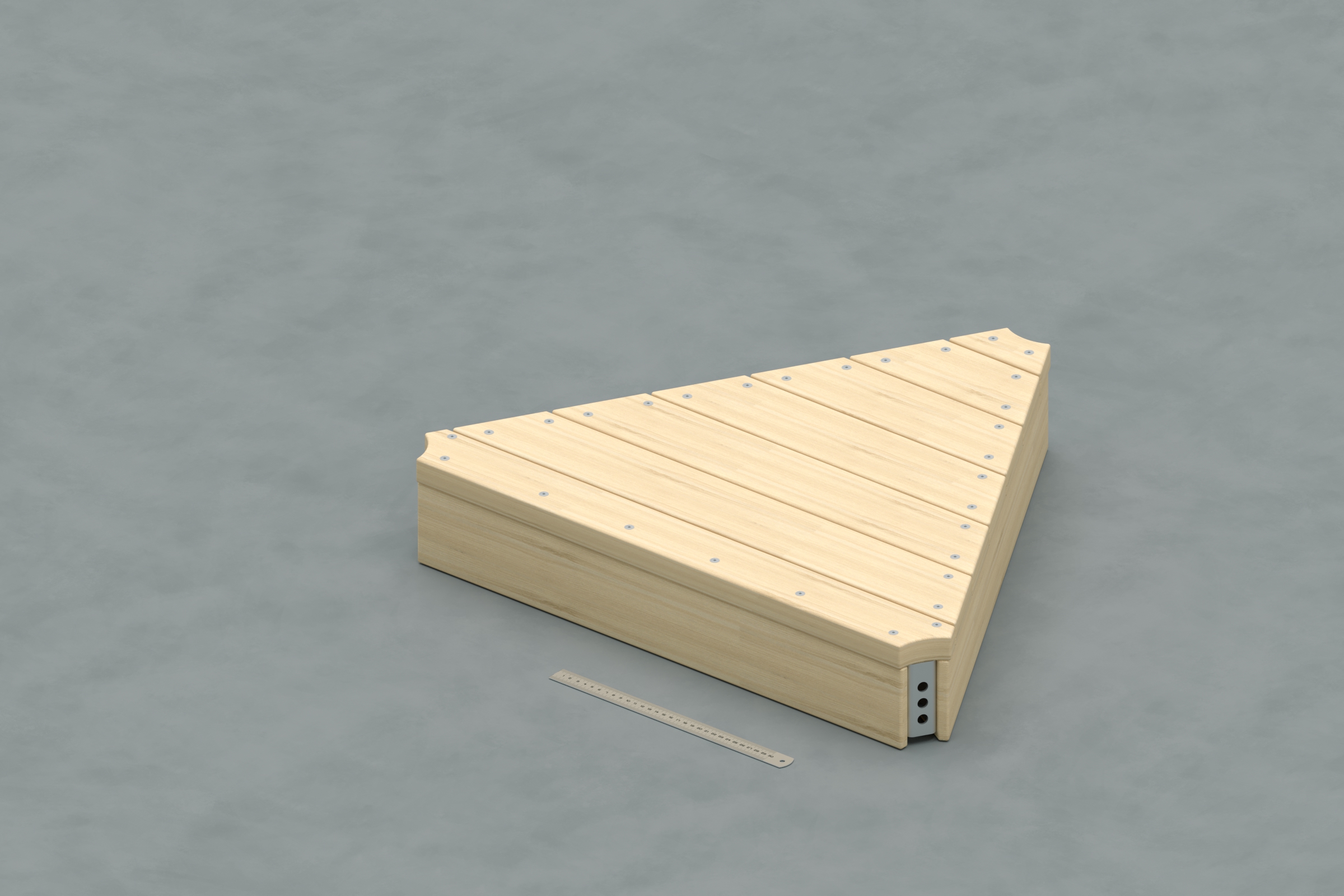 Art.: 1200001 | Podestboden aus Brettern, 30 mm dick und umlaufenden Kantholzunterzügen 45 x 100 mm. Die getrockneten Schnitthölzer aus Robinie sind gehobelt, gefast und frei von Faulästen. Kraftschlüssige Bodenbefestigung durch spezielle Edelstahlwinkel und einer durchgehenden Bolzenverschraubung.