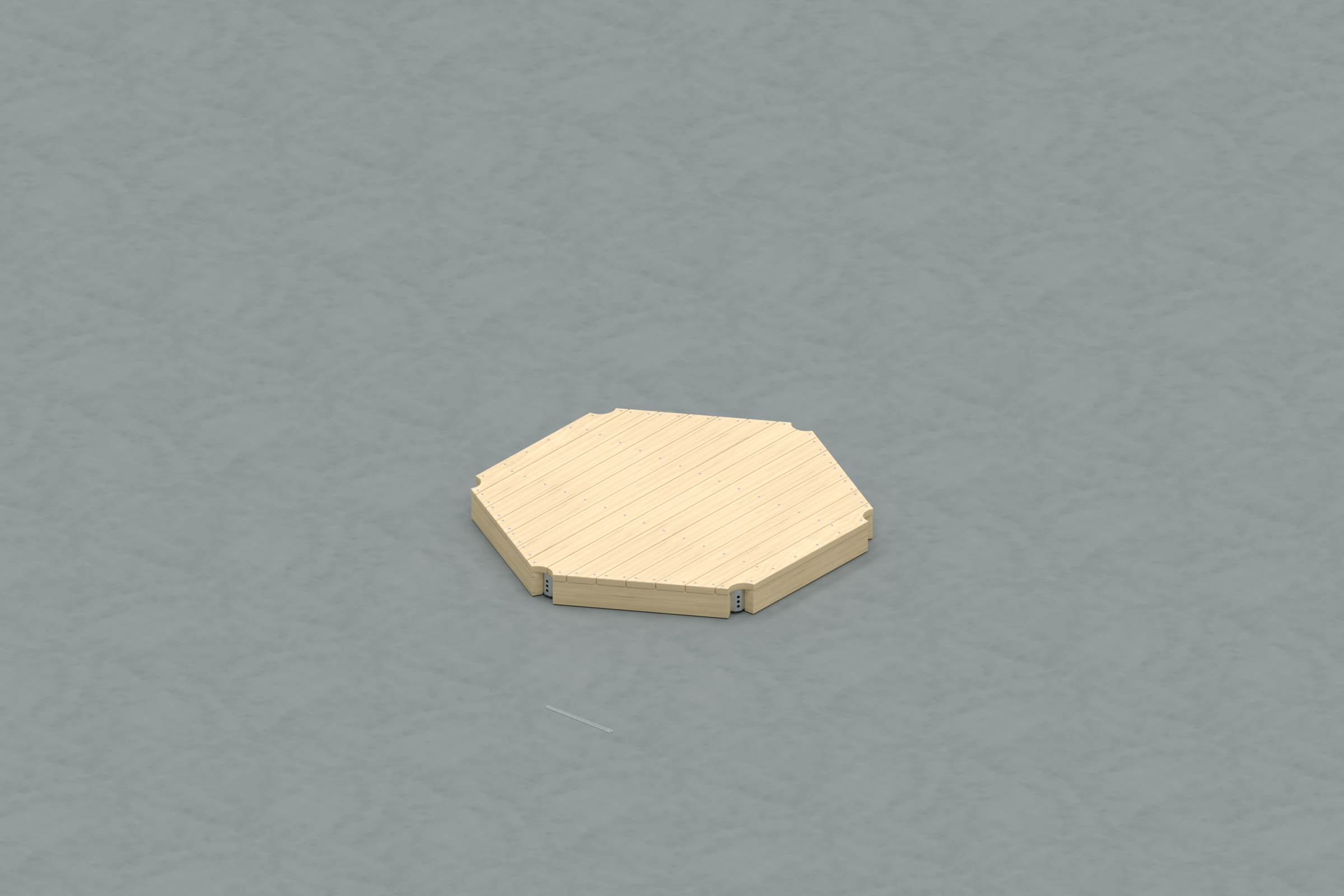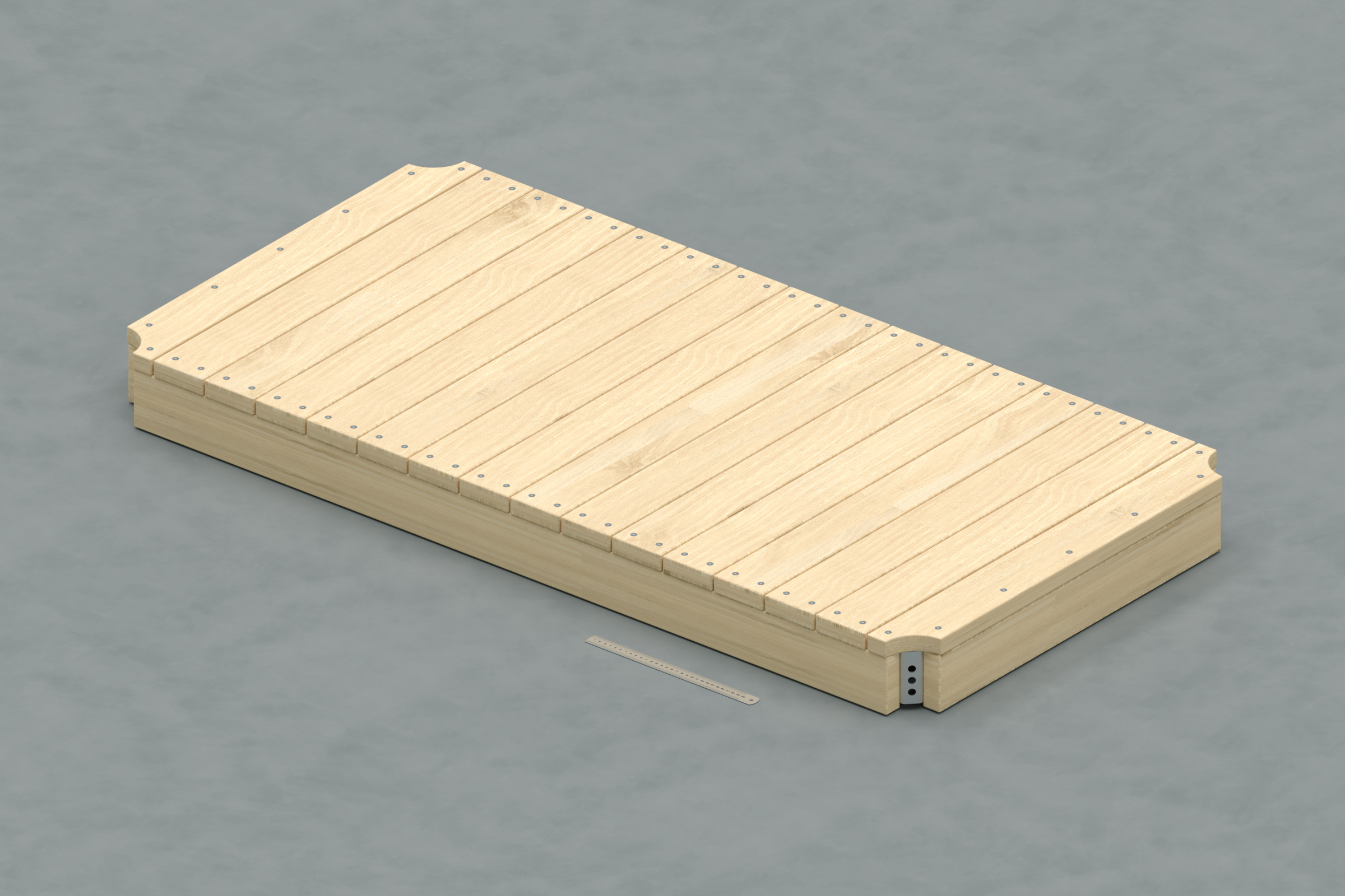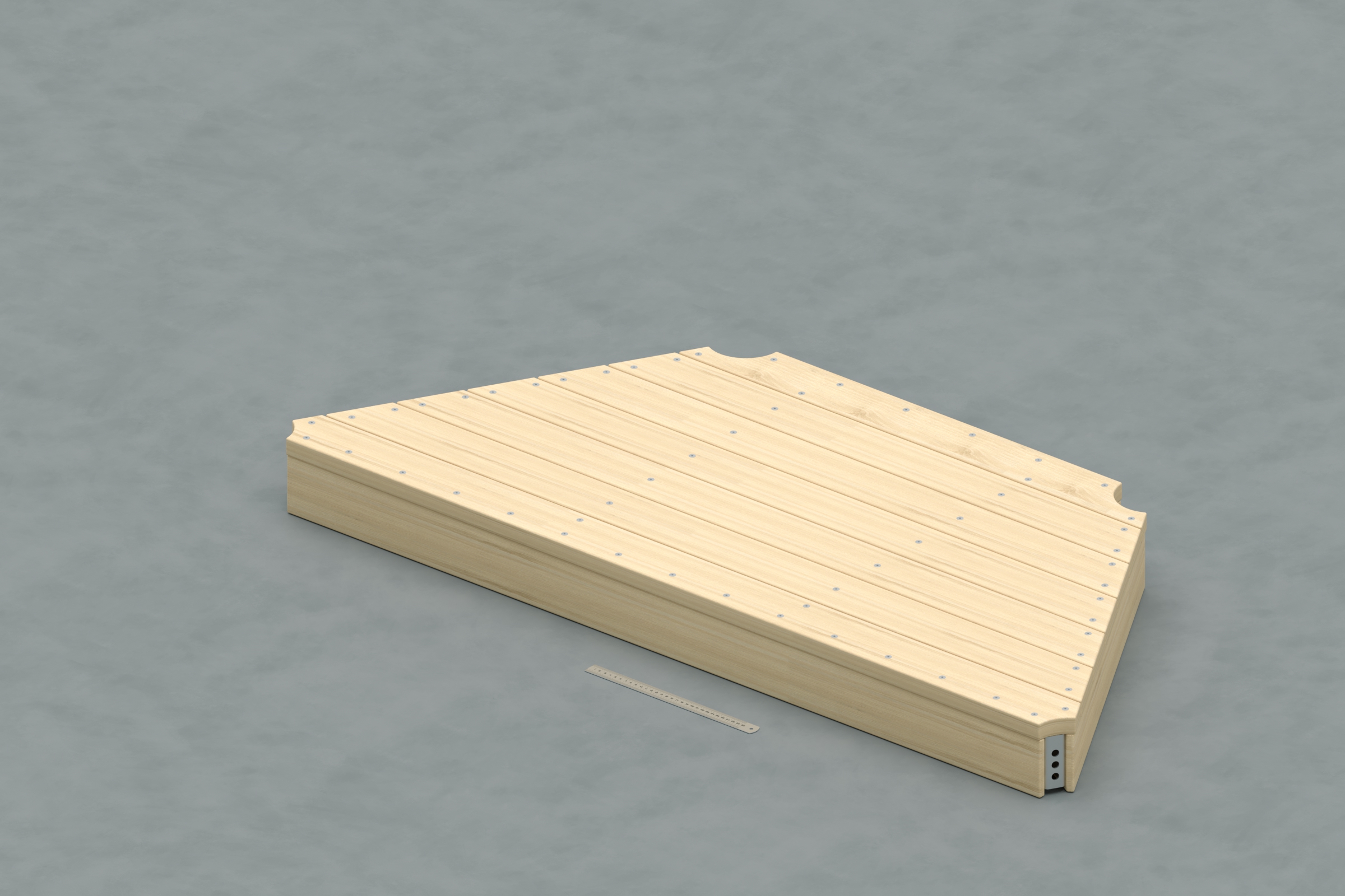 Art.: 1200004 | Podestboden aus Brettern, 30 mm dick und umlaufenden Kantholzunterzügen 45 x 100 mm. Die getrockneten Schnitthölzer aus Robinie sind gehobelt, gefast und frei von Faulästen. Kraftschlüssige Bodenbefestigung durch spezielle Edelstahlwinkel mit einer durchgehenden Bolzenverschraubung.