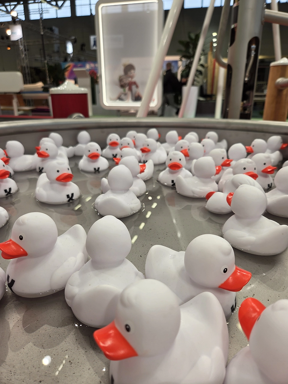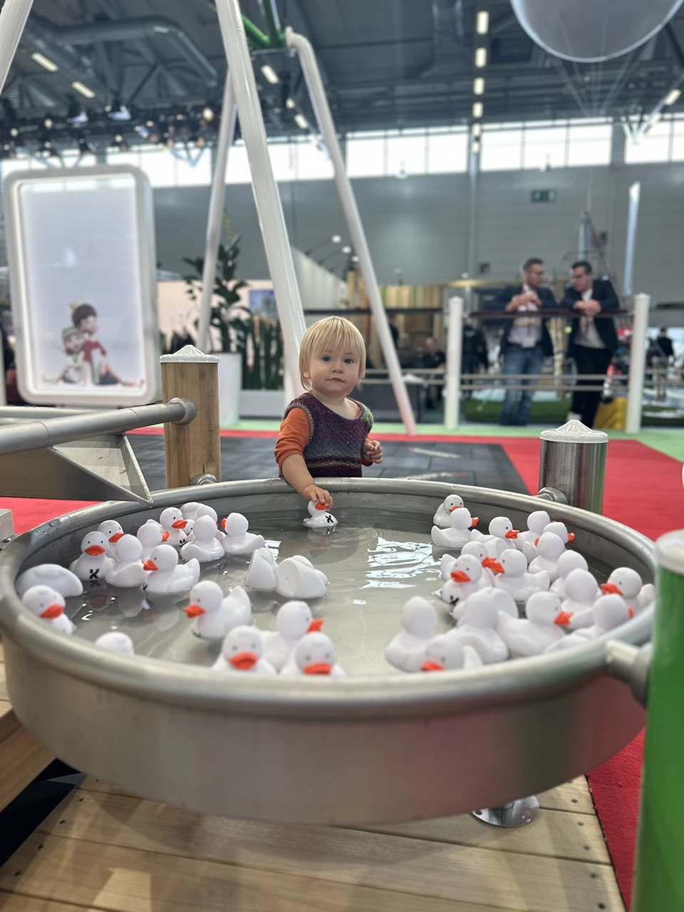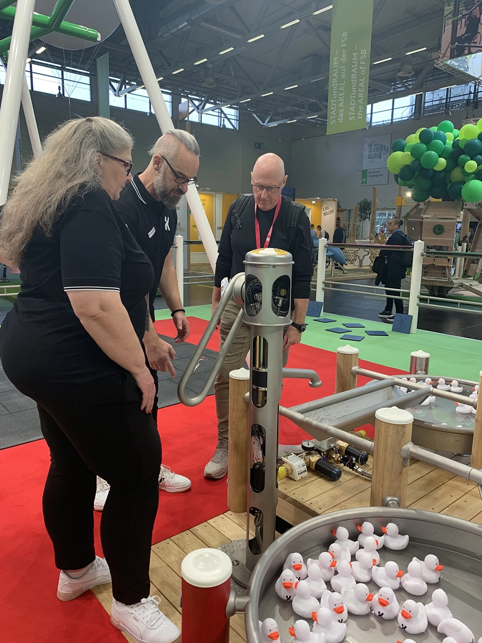 Besonders beliebt bei allen, die neugierig erkunden und mit Elementen spielen wollen, war das Wasserspiel von Kaiser & Kühne. Selbstverständlich war auch dies kein Schauobjekt, sondern ein echtes Mitmach-Highlight, das immer wieder aufs Neue faszinierte und mit richtigem Wasser natürlich die kleineren Besucher angezogen hat, aber auch die großen, die sich für ihre Kinder (oder für sich selbst) eine der vielen Kaiser & Kühne Gummienten mit nach Hause nehmen wollten.