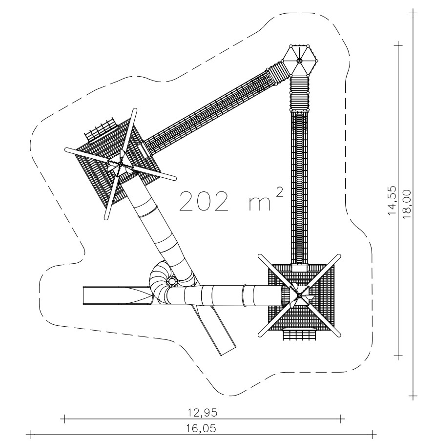 Zwei Dalbentürme (10,50) mit Netzaufstieg (1,00) und Windrotor, verbunden durch Rollenbahn-Tunnelrutschen-Kombination (6,00).