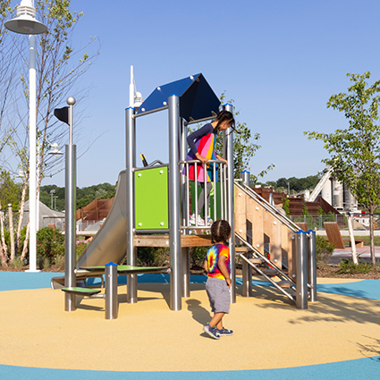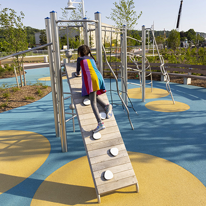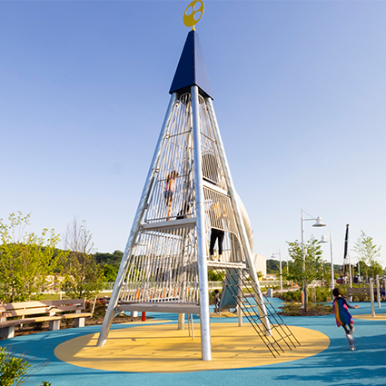 „Wir wollten etwas anderes machen“, erinnert sich Parisi. Das Designteam wollte keinen weiteren typischen städtischen Spielplatz mit seiner vorhersehbaren Ansammlung von Schaukeln, Rutschen und Kletterstangen. „Wir haben uns bei europäischen Herstellern gezielt nach etwas umgesehen, das wie ein Turm aussieht, das sich origineller anfühlt … Das war unser Ziel.“