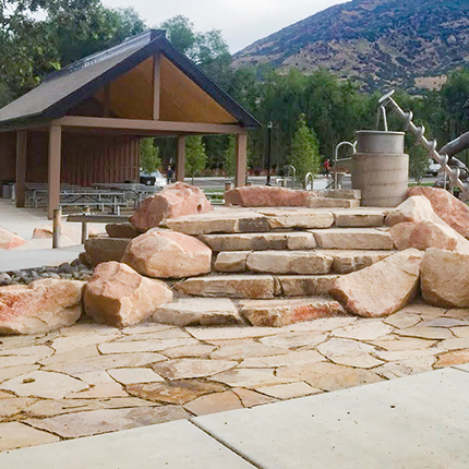 Das Design bezieht sich auch auf die Geschichte des Geländes, sagt Holly Smith, eine stellvertretende Stadtmanagerin der Stadt Holladay. Jahrhunderte von dem holländischstämmigen Mühlenbesitzer und Tischlermeister Rasmus Knudsen besiedelt wurde, diente das Land, auf dem der Park errichtet wurde, im Laufe der Zeit als Getreidemühle, Familiencampingplatz, Jagdhütte und Erdbeerfarm. Im Laufe seiner Geschichte war die Bewässerung für die landwirtschaftliche Nutzung und die Freizeitgestaltung von entscheidender Bedeutung.