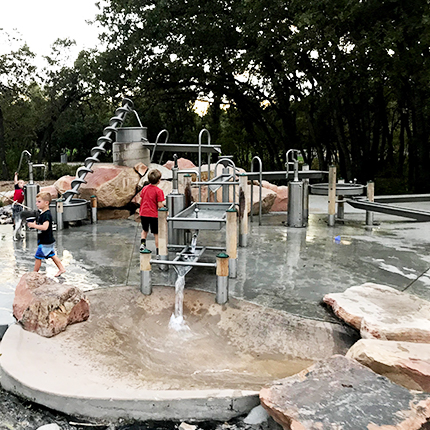 Ein besonders gelungenes Beispiel ist der Wasserspielbereich im Knudsen Park in Holladay, Utah, der von Eric Lyman, Inhaber des gleichnamigen Büros E.A. Lyman Landscape Architects, in Zusammenarbeit mit Selph entworfen wurde. Der 4.000 Quadratmeter große Wasserspielbereich, der im Mai zeitgleich mit der Eröffnung des Parks enthüllt wurde, liegt im Schatten der Wasatch-Bergkette und umfasst eine Reihe von Rinnen, Becken und Dämmen aus Edelstahl, die über gegossenem Beton installiert wurden. Die Kinder arbeiten allein oder, häufiger, mit Betreuern und anderen Kindern, um den Wasserfluss zu lenken. Mit handbetätigten Pumpen, Toren und Kurbeln üben sie ihre feinmotorischen Fähigkeiten, während sie das Wasser durch das System bewegen – oft über längere Zeiträume hinweg.